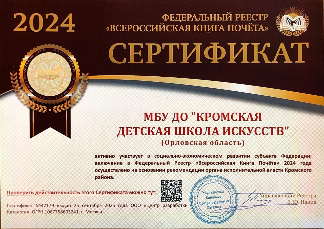 За активное участие в социально-экономическом развитии Орловской области Кромская детская школа искусств включена в Федеральный Реестр «Всероссийская Книга Почëта» 2024 года.